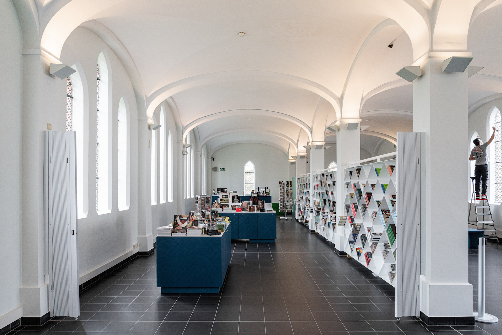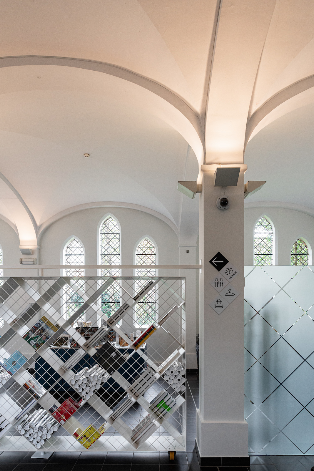 De onthaalruimte is flexibel indeelbaar via een aantal imposante stalen pivoterende shopkasten. Deze kasten tussen de kolommen maken het mogelijk de ruimte tijdelijk af te sluiten voor nocturnes, tijdelijke evenementen of colloquia.