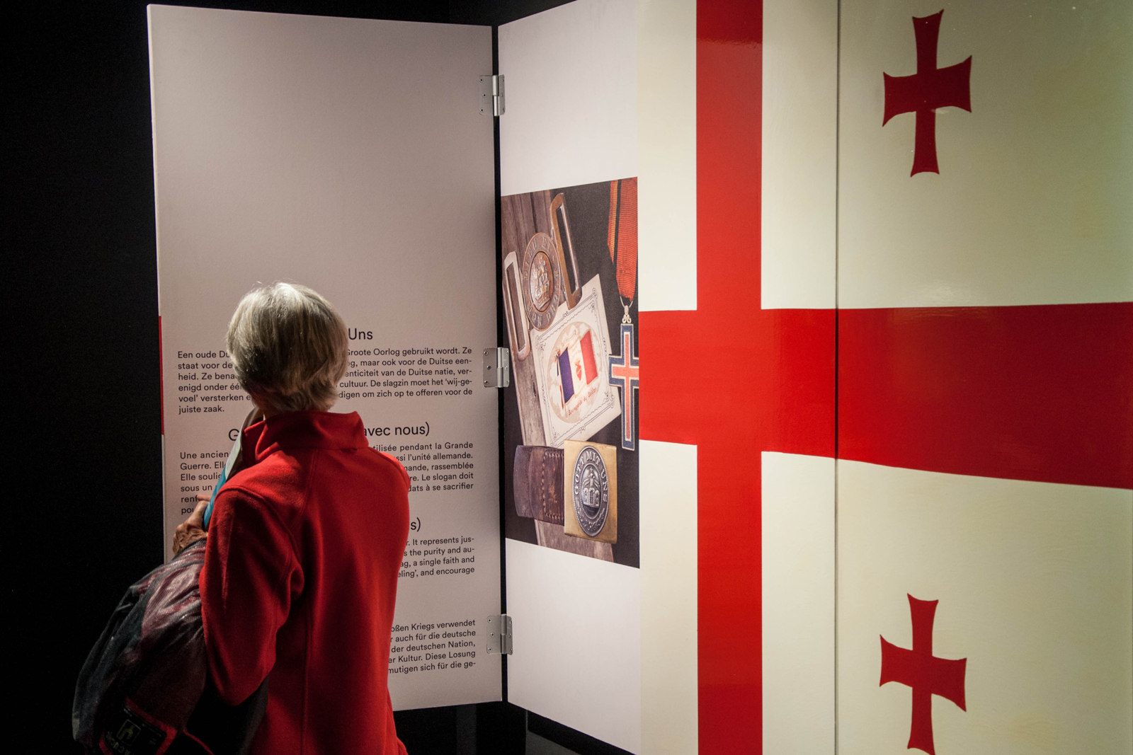 Het fel beladen IJzertorenmonument vertelt vanaf 2014 het relaas van het Belgisch-Duits front, de bezetting van het land tijdens de Groote Oorlog en de Vlaamse Ontvoogding. Met de keuze voor ‘Wat rest van het leven. Wat blijft van het land.’ trekken we als tentoonstellingsmakers een radicale rode draad doorheen de verschillende thema’s, een vertellijn die een welbepaalde invulling aan de thema’s geeft. Ons narratief confronteert de vereenvoudigde ‘grote geschiede- nis’ van naties, volkeren en staatshoofden met ‘kleine geschiedenissen’ in de marge die de oorlog heel concreet maken: verrassende perspectieven, persoonlijke en regionale verhalen en weinig bekende historische feiten. Het thema ‘nationale identiteit’ wordt geanalyseerd in ‘Vensters op nationale identiteit’ die vanuit de geschiedenis van de oorlog linken leggen naar het heden.