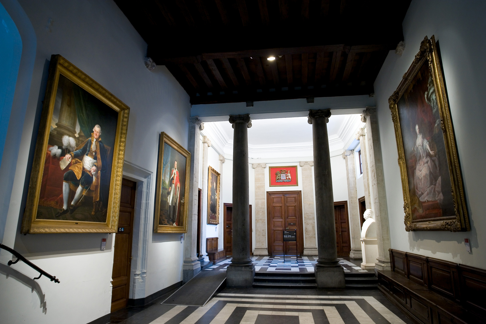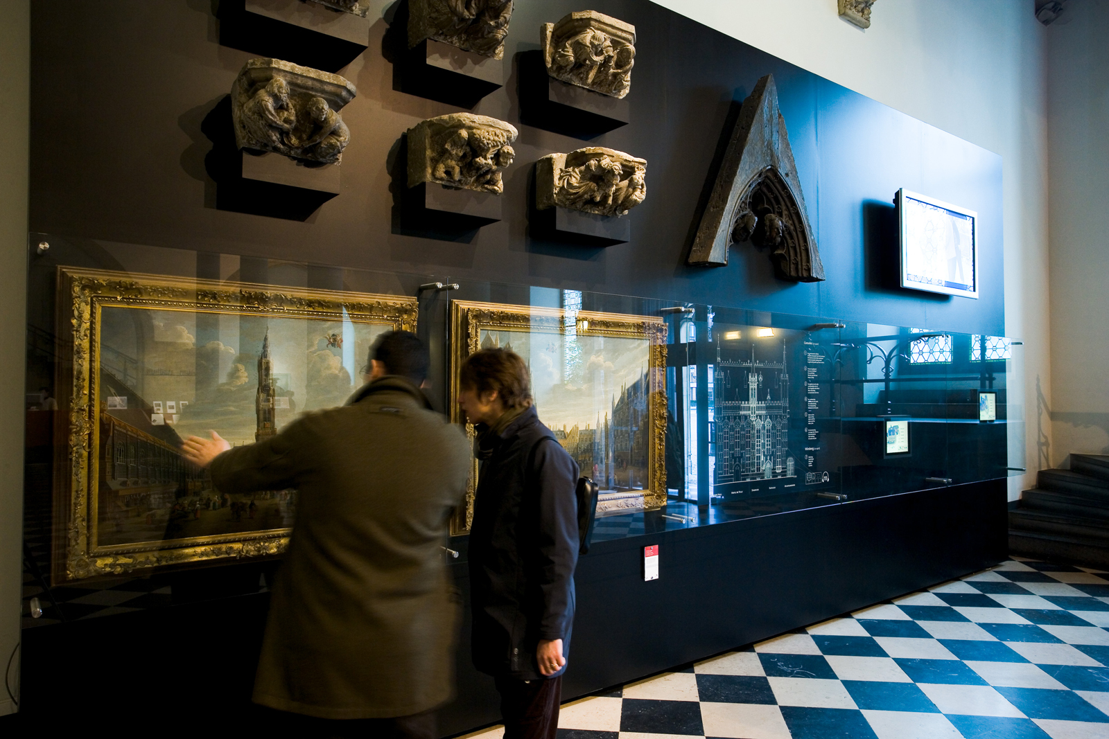 De grote benedenhal van het stadhuis wordt heringericht met een nieuwe onthaalbalie voor het museum en de stadsdiensten, een wand met interactieve informatie over de geschiedenis van het stadhuis en een permanente schilderijententoonstelling in de centrale middengang.